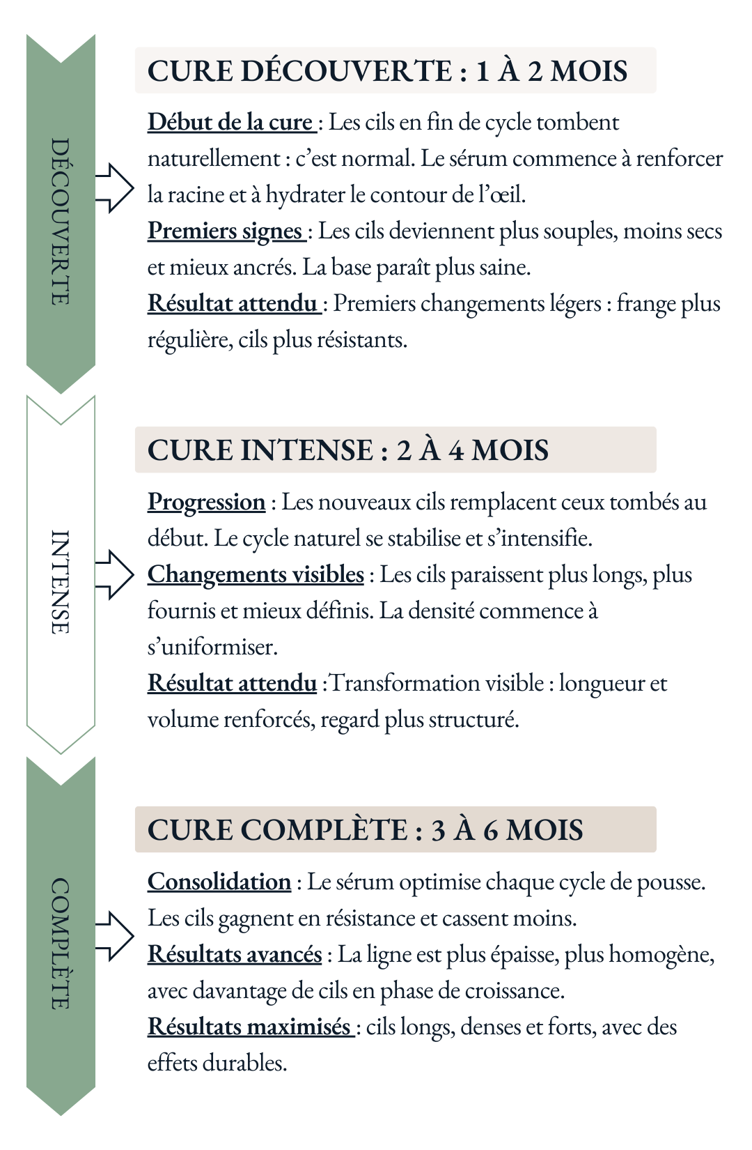 Comme les cheveux, les cils ont un cycle de vie naturel. Pour conserver des cils longs et denses, il est recommandé de continuer une application régulière.